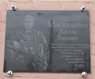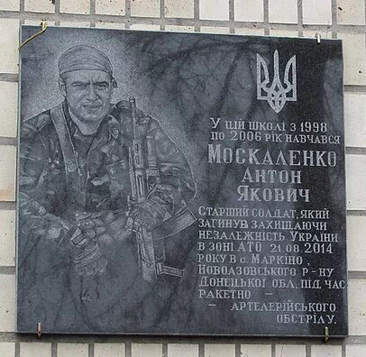 Меморіальна дошка жмеринчанину Антону Москаленко, старшому солдату, який загинув, захищаючи Незалежність України в зоні АТО. Дошка встановлена на будівлі Загальноосвітньої школи І-ІІІ ступенів № 3.
