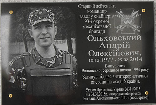 Меморіальна дошка Ольховському Андрію Олексійовичу встановлена на фасаді Валківського ліцею імені Олександра Масельського.